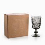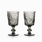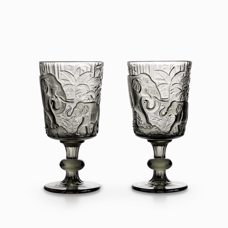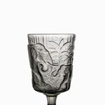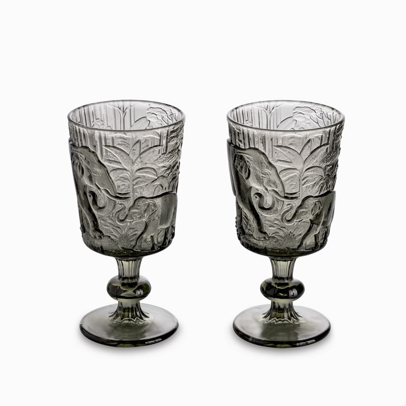 Cada copa de 270ml presenta un delicado grabado de elefantes en relieve, aportando una textura visual y táctil única que se convierte en el centro de atención. El color gris traslúcido añade un aire de modernidad y misterio, alejándose del cristal convencional para ofrecer una mesa con más carácter. Fabricadas en vidrio resistente y duradero, con un peso sólido de 0,4 Kg por pieza que garantiza estabilidad y una sensación premium al tacto.