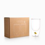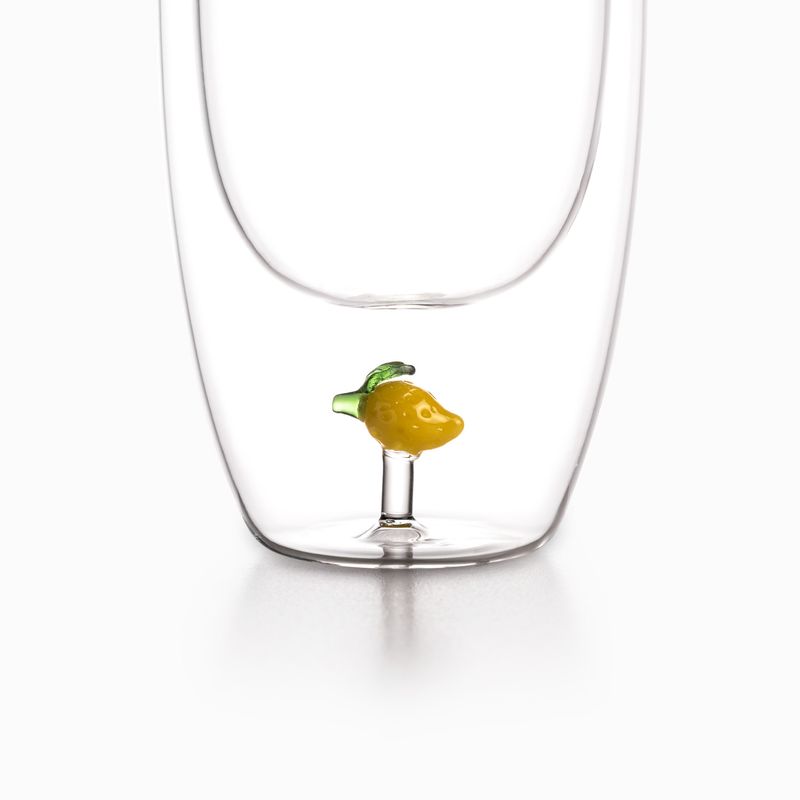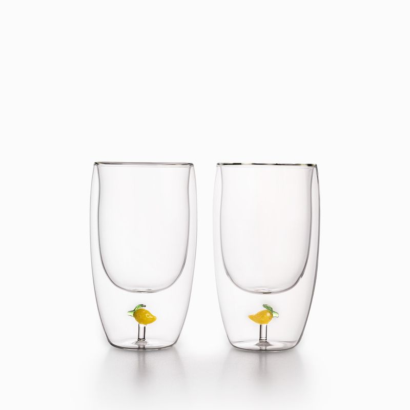 El vaso limón doble pared se presenta en un set de 2 unidades, ideal para disfrutar de una merienda o un café especial en compañía. Cada vaso tiene una capacidad de 350 ml, el tamaño perfecto para tés helados, lattes, jugos naturales o infusiones calientes. Su estructura de dos capas de vidrio crea una cámara de aire que funciona como aislante térmico, manteniendo la temperatura de tus bebidas (frías o calientes) por mucho más tiempo. En el fondo del vaso se encuentra una pequeña figura de un limón, genera un efecto visual encantador, pareciendo que la fruta flota bajo tu bebida.